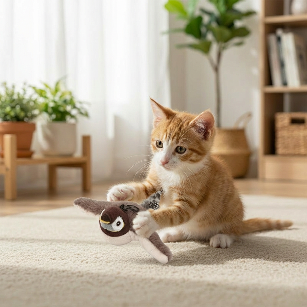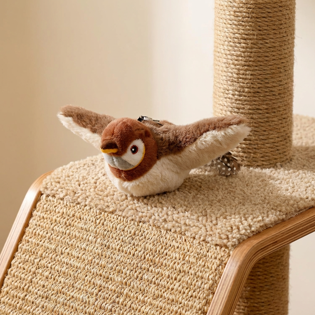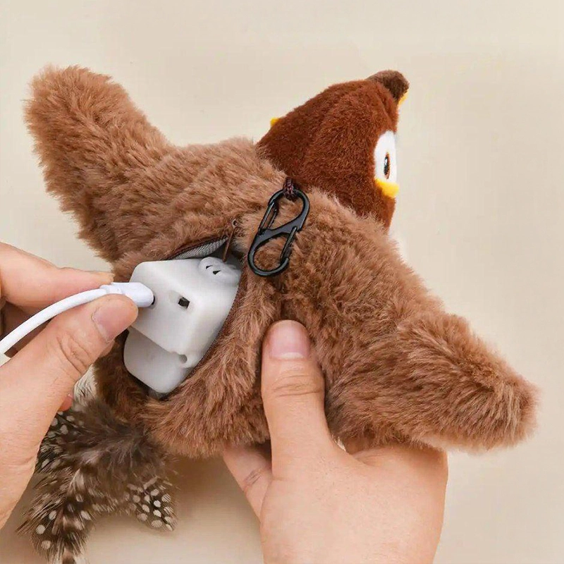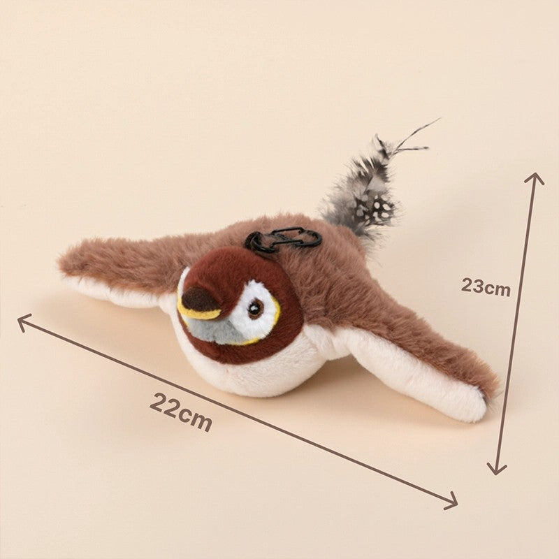 Ez a csapkodó madár úgy lett kitalálva, hogy puha plüss testtel, könnyű súllyal és kontrollált mozgással adja meg a vadászat élményét, esés vagy sérülésveszély nélkül. A csapkodó szárnyak, a csiripelés és a rejtett macskamenta arra ösztönzik a cicát, hogy ugorjon, csapjon, fusson vagyis pont azt a mozgást végezze, amire az ízületeinek és az idegrendszerének is szüksége van. Így nem a kanapét, hanem a saját madarát”fogja levezető játéknak használni.
