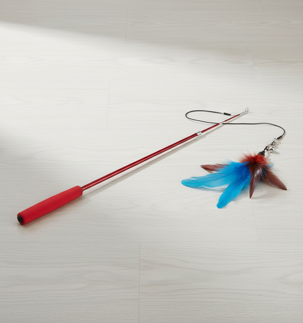 A hosszú pálca és zsinór miatt könnyen tudsz úgy játszani, hogy a cica a szabadabb területeken fusson és ugorjon, nem a polcok között. Elég egy kisebb szoba, folyosó vagy nappali, a ruganyos pálca miatt te kis helyen állva is nagy mozgást tudsz neki adni.